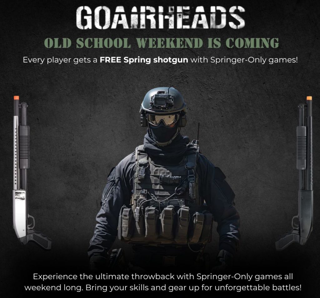 Old School Day is coming back for Old School WEEKEND over Valentine’s Day Weekend! February 13th, 14th and 15th come on out! Hours are from 10:00 am – 5:00 pm. All entrances get a FREE spring shotgun! We will be switching between “Old School” (springer ONLY) games, and our “Normal” (AEG/HPA, etc.) games throughout the … Continue reading “Old School” Weekend! 2/13th, 14th & 15th